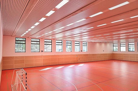 Die innovativen Deckenstrahlungsheizungselemente sparen bis zu 50% Energie und können in einem ballwurfsicheren Deckenverkleidungssystem, mit integrierter LED-Beleuchtung, verlegt werden.