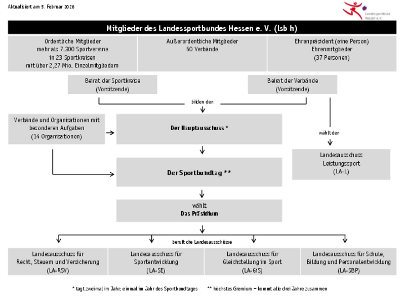 Welche Gremien und Ausschüsse gibt es beim Landessportbund? Diese und weitere Fragen zur Organisation des Landessportbundes beantwortet das Organigramm des lsb h. Eine Version zum Download finden Sie hier